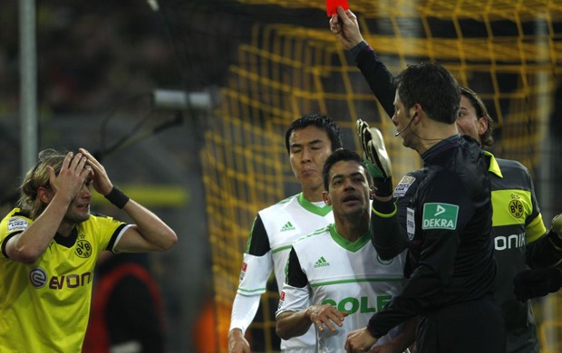 O lateral Marcel Schmelzer, do Borussia Dortmund, não precisará cumprir suspensão por sua expulsão contra o Wolfsburg, no último sábado. Nesta segunda-feira, após o árbitro da partida, Wolfgang Stark, admitir que errou ao punir o jogador, a Federação Alemã de Futebol anunciou que o cartão vermelho do atleta foi revogado. No lance polêmico, Stark marcou pênalti após achar que a bola bateu na mão de Schmelzer dentro da área e ainda expulsou o lateral. Na cobrança, o brasileiro Diego marcou para o Wolfsburg, que, no fim, venceu o Dortmund por 3 a 2. - Normalmente, a expulsão de um jogador significa suspensão de pelo menos um jogo, já que a Fifa geralmente protege as decisões dos árbitros. A única exceção é quando a expulsão é obviamente e, sem margem de dúvida, baseada no erro do árbitro – explicou a federação germânica, em comunicado oficial. No domingo, Stark já havia reconhecido o equívoco. - Eu achava com certeza que o jogador havia parado a bola com a mão. A repetição na televisão mostra que não foi assim. Eu errei e naturalmente lamento - disse o árbitro. Com a anulação de seu cartão vermelho, Schmelzer estará à disposição do técnico Jurgen Klopp para a partida contra o Hoffenheim, no próximo domingo.